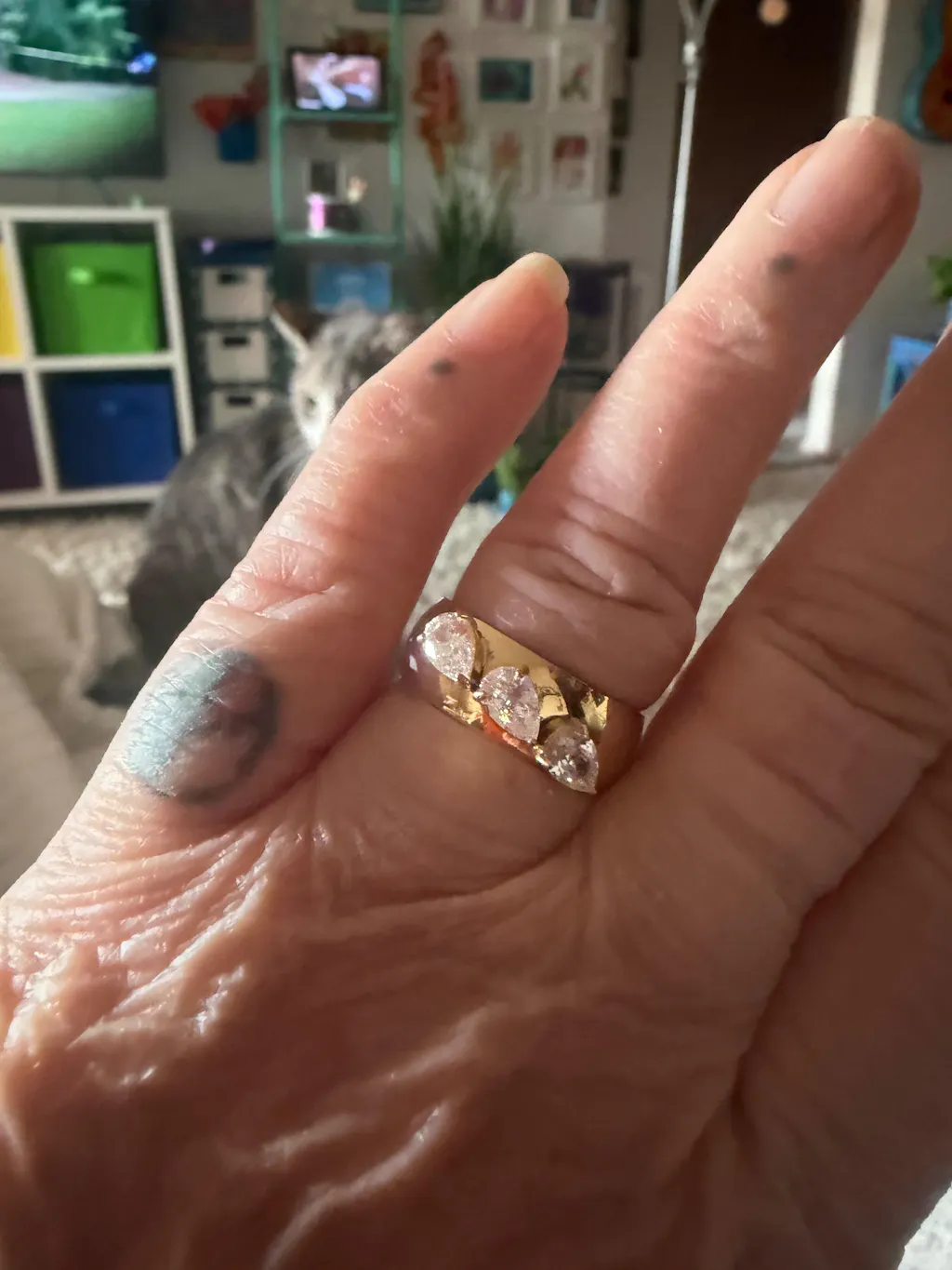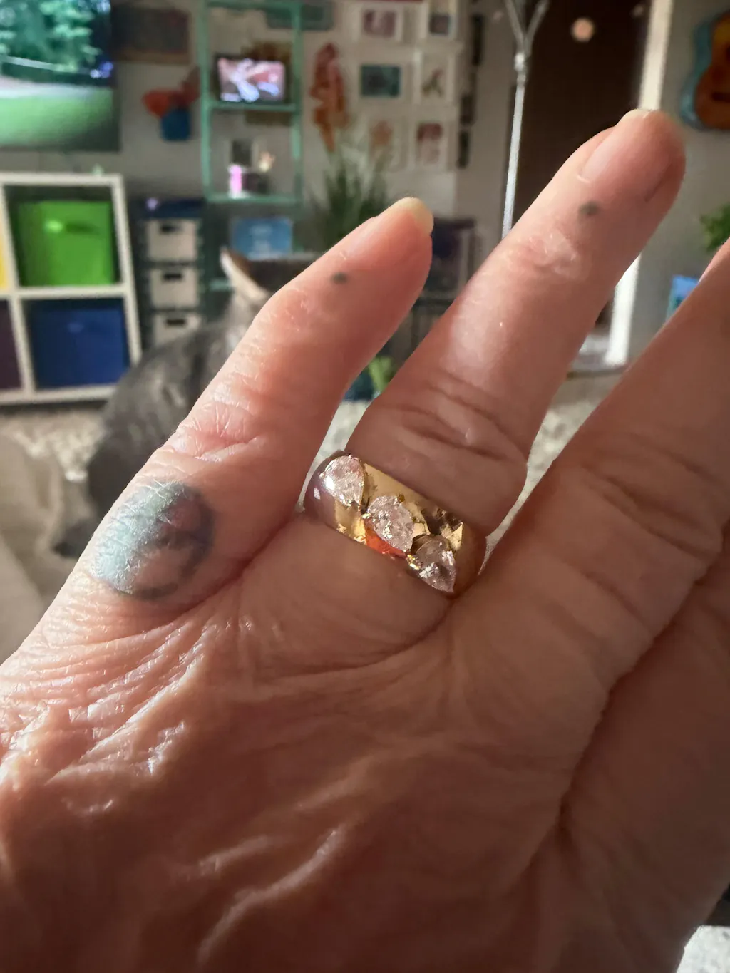 Its design features three zirconia stones, elegantly studded with crystals, creating a dynamic look that catches the light from every angle.